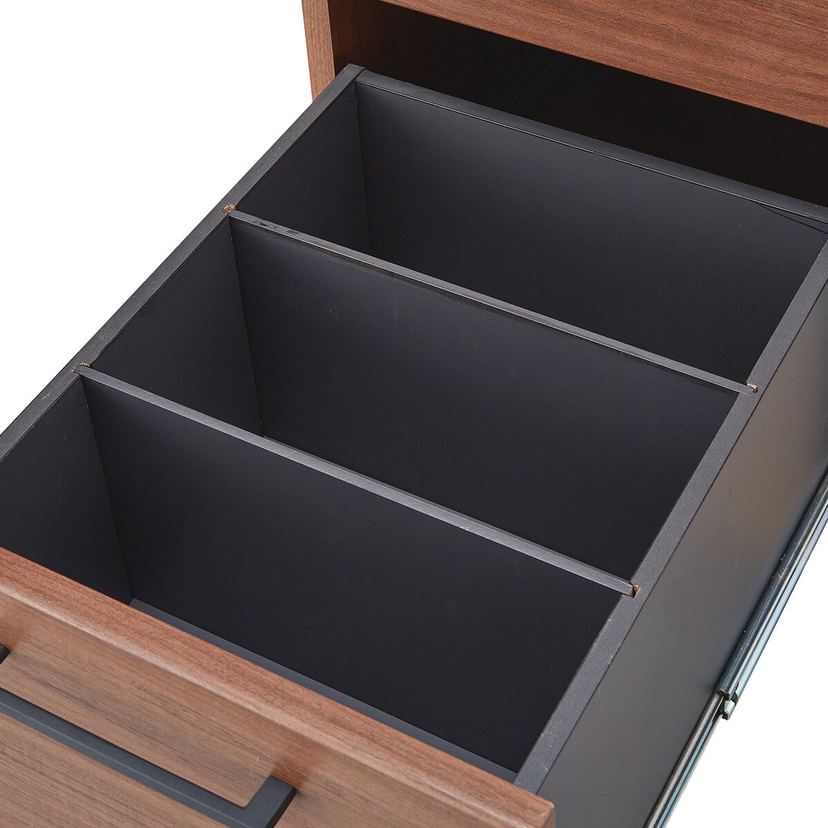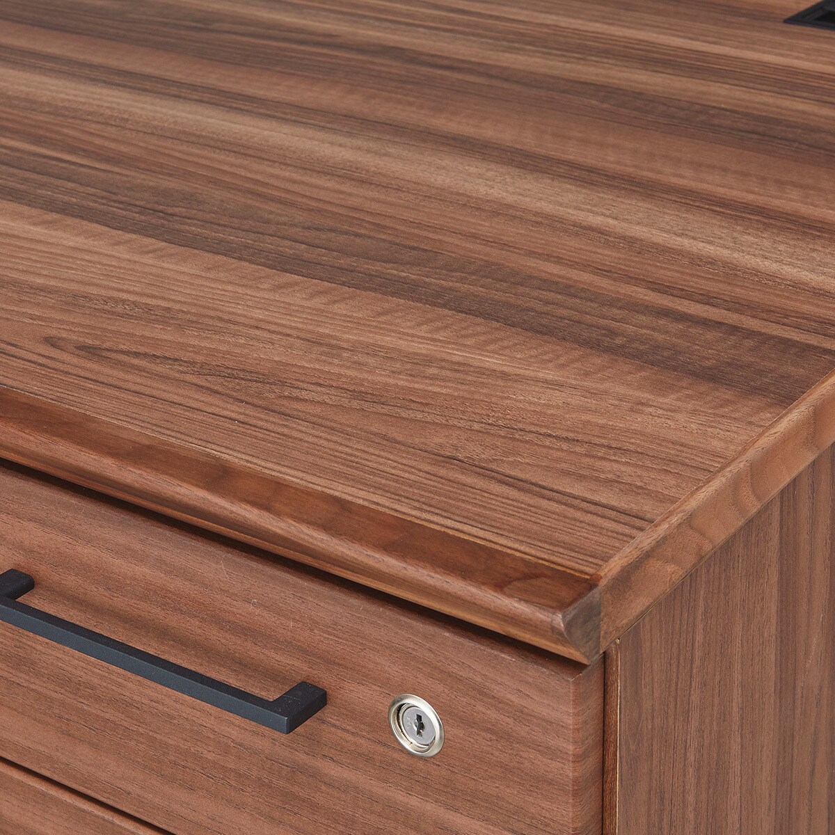 - Con cajoneras en pedestales de 2 cajones papeleros y 1 cajón de archivo cada una con correderas reforzadas de extensión total, chapa de cerradura general, jaladeras metálicas.