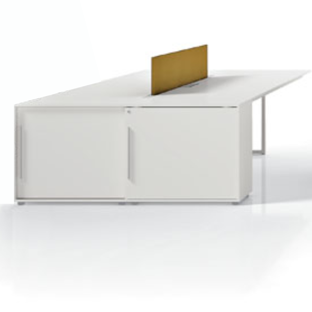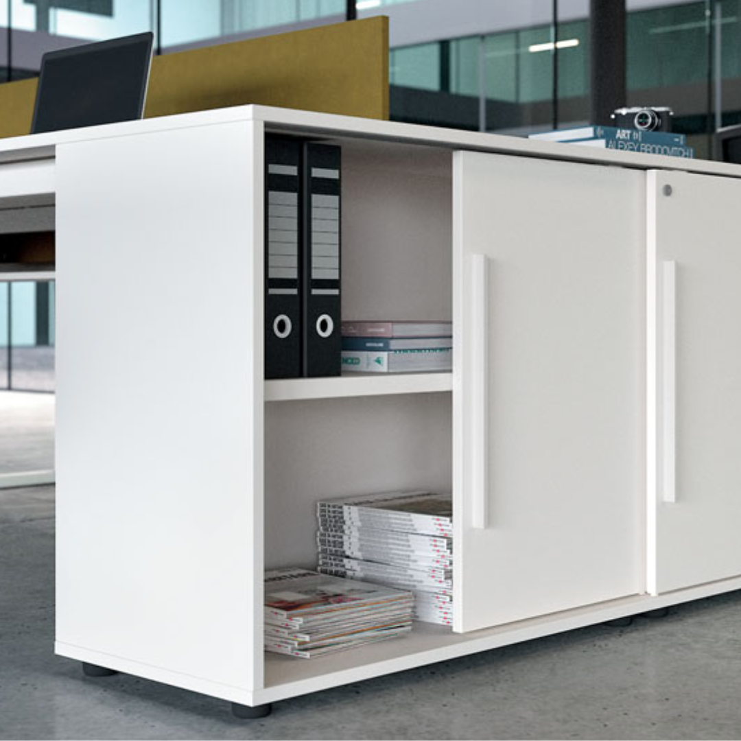 • En lateral espacio portante con puertas corredizas en melamina con un entrepaño en su interior para el resguardo de objetos y/o archivo con cerradura general.
