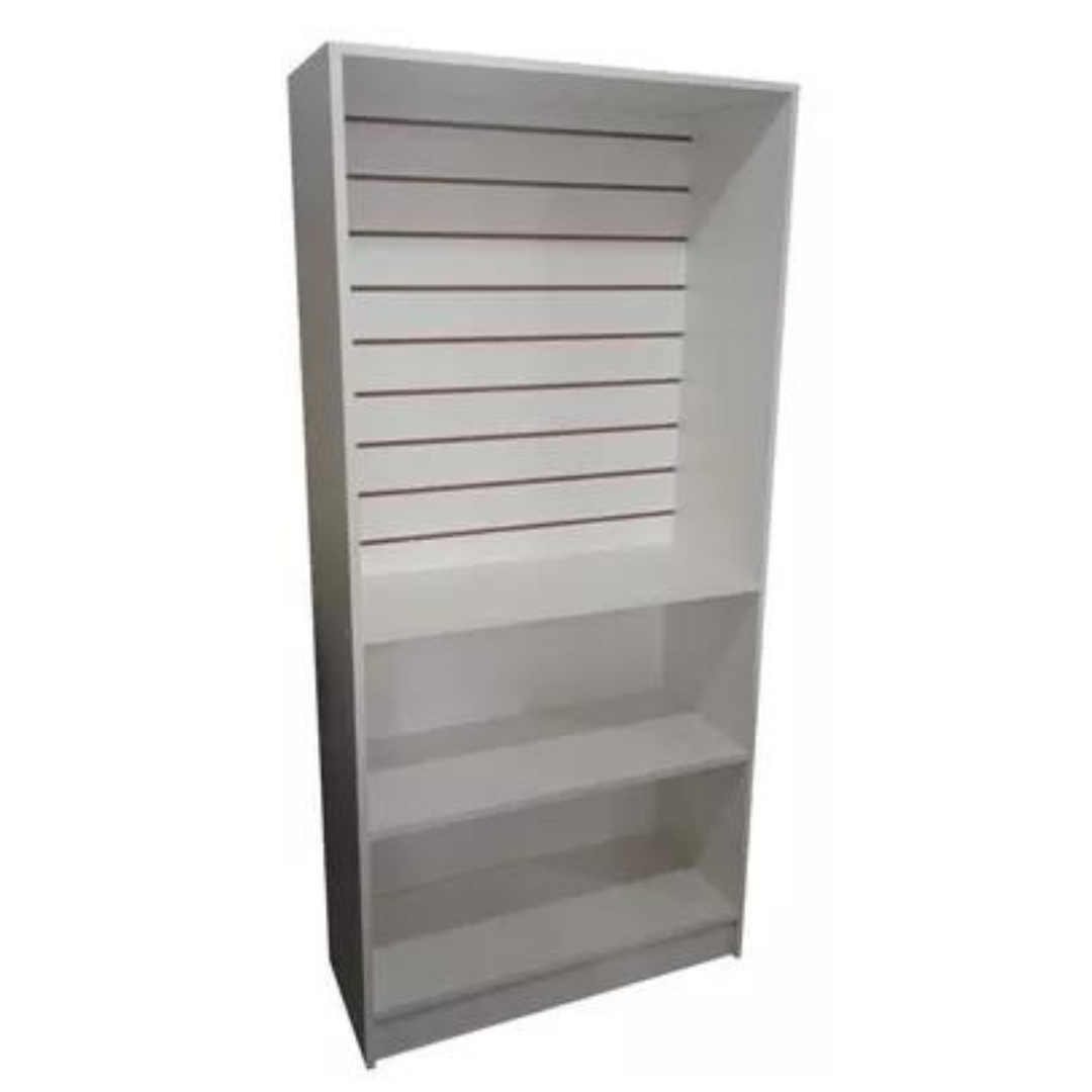 - Mueble exhibidor alto estilo moderno con fondo ranurado, fabricado en melamina.