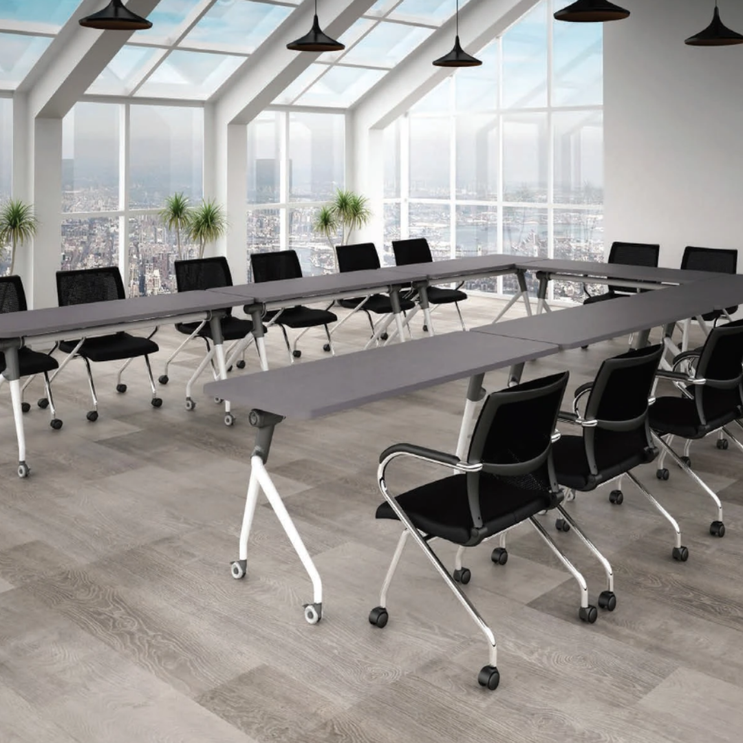 - Mesa modular de juntas de 12 a 14 personas compuesta por seis mesas con cubierta fabricada en melamina de 24 mm y cantos pvc termofusionados.