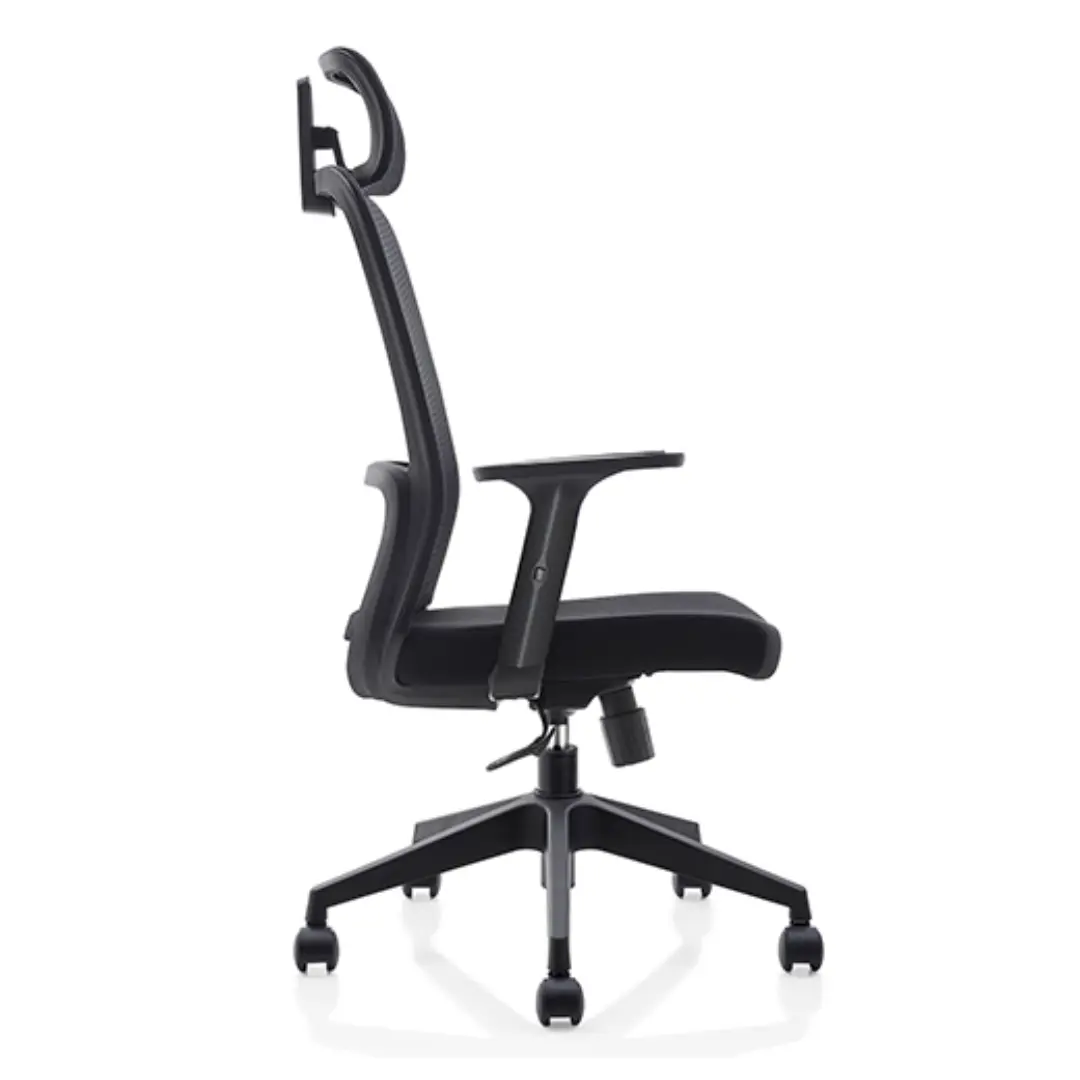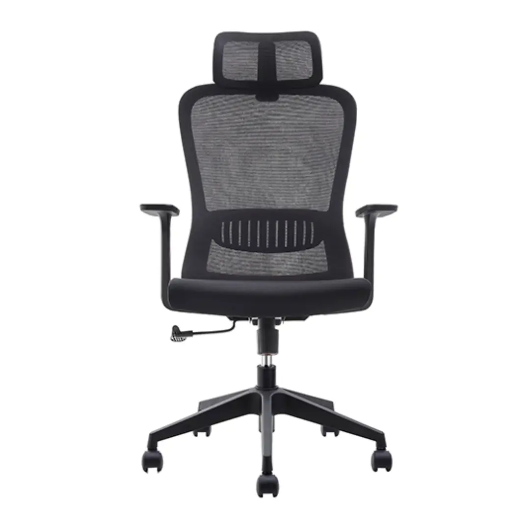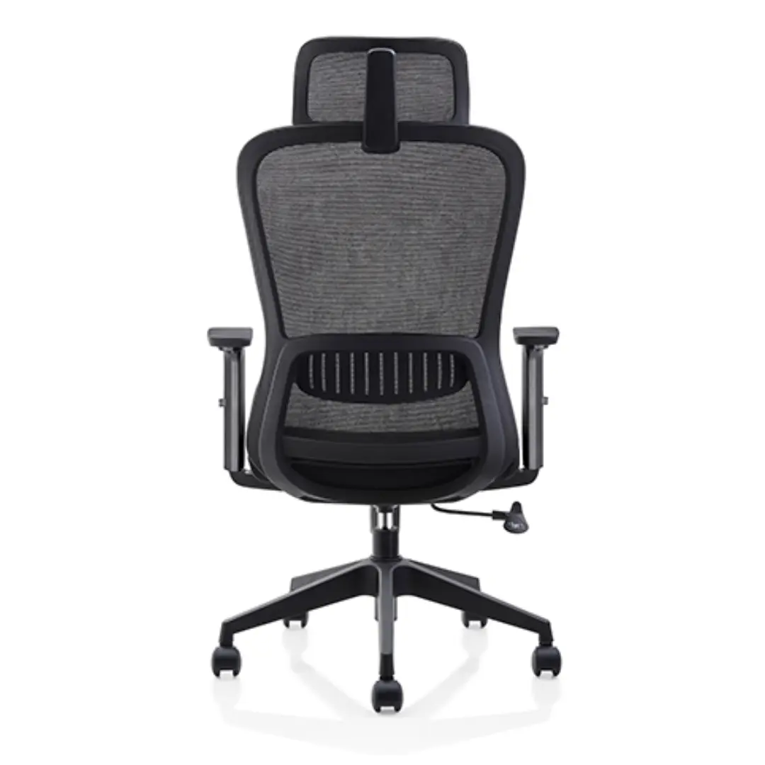 - Respaldo en malla de diseño ergonómico con soporte lumbar ajustable y cabecera ajustable.