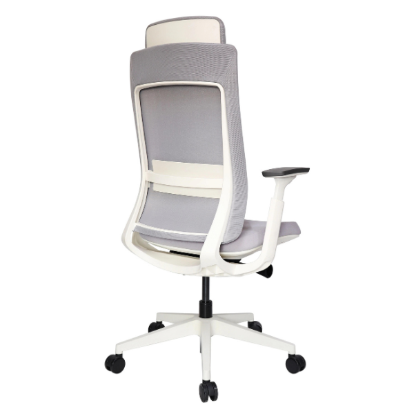 Silla de oficina ejecutiva con respaldo en malla de diseño ergonómico con cabecera, Brazos tipo 3D giratorios y ajustables de altura en poliuretano semi-rígido y suave. Diseño moderno y cómodo.