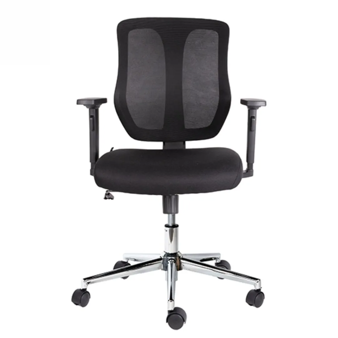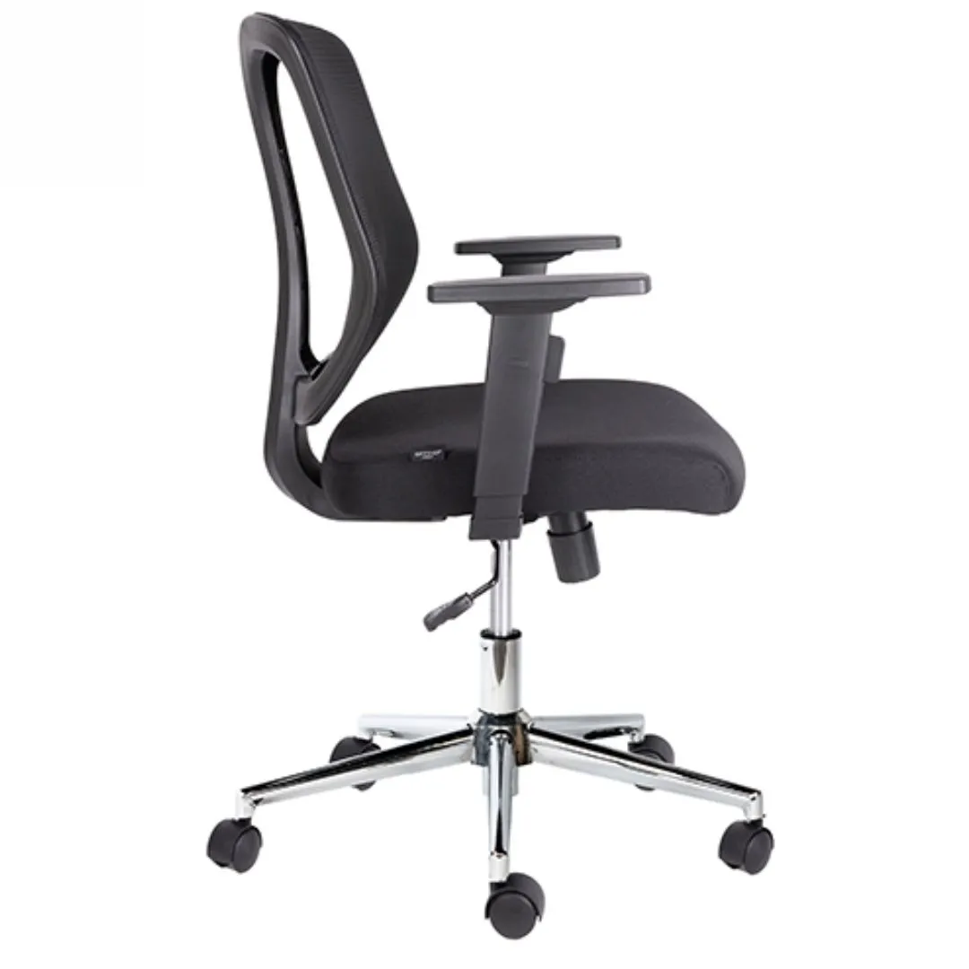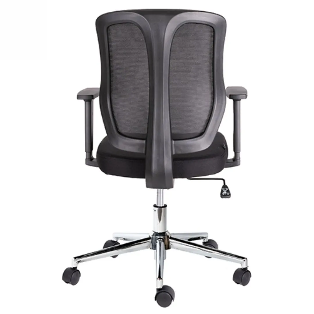 - Tapiz en respaldo de malla de color negro y asiento en tela 100% poliéster color negro, funda tapizada y pespuntada.